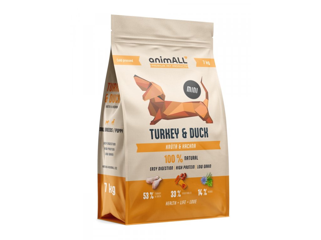 animALL Mini Turkey & Duck jsou vysokoproteinové bezlepkové psí granule ve variantě krůta a kachna vhodné zejména pro malá plemena a štěňata. Toto lehce stravitelné originální krmivo s batáty je doplněno o beta-glukany podporující imunitu.
