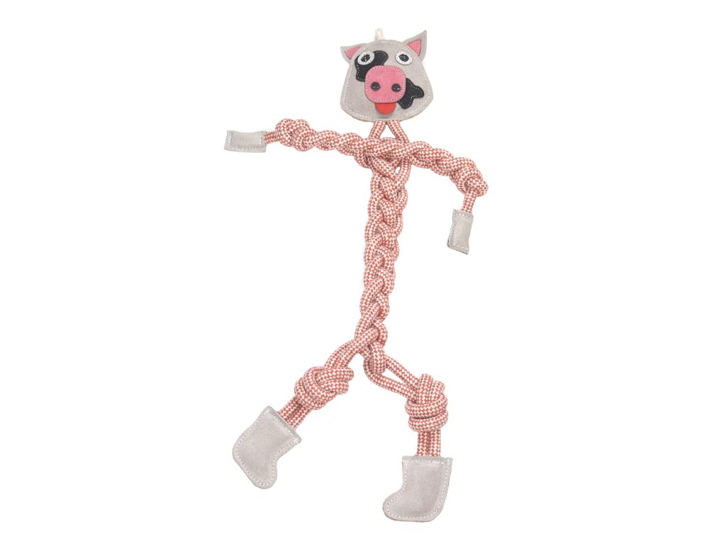 Hračka ve tvaru krávy z kombinace přírodní kůže, vlněné plsti, juty a jutovo-bavlněného lana určená pro psy.