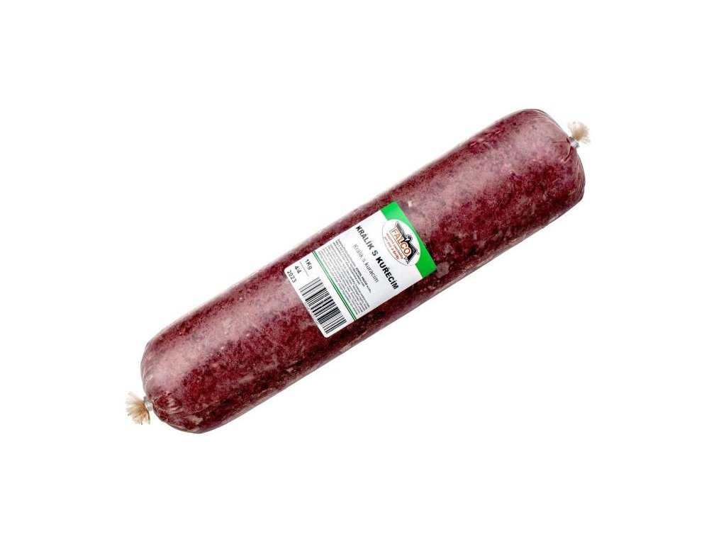 Mletá směs z králičího a kuřecího masa. Vše obsažené v cca 1kg balení. Salám je balen ve varném střevě, které lze vařit i s obalem.