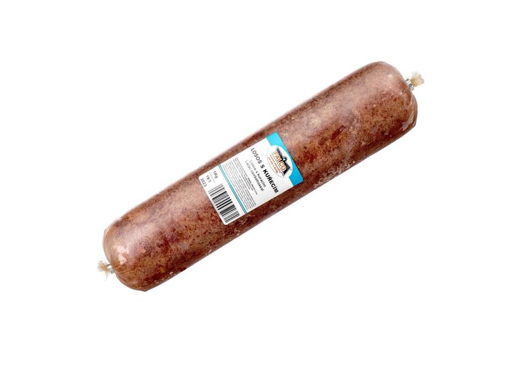 Mletá směs z lososa a kuřecího masa. Vše obsažené v 1kg balení. Salám je balen ve varném střevě, které lze vařit i s obalem.