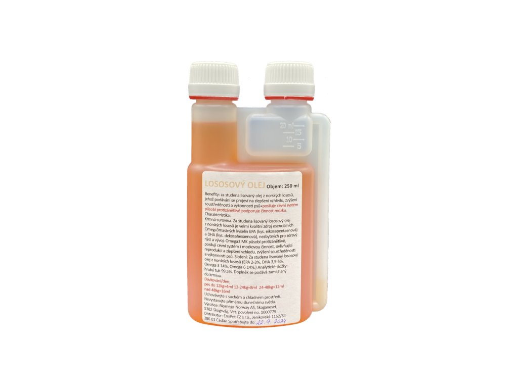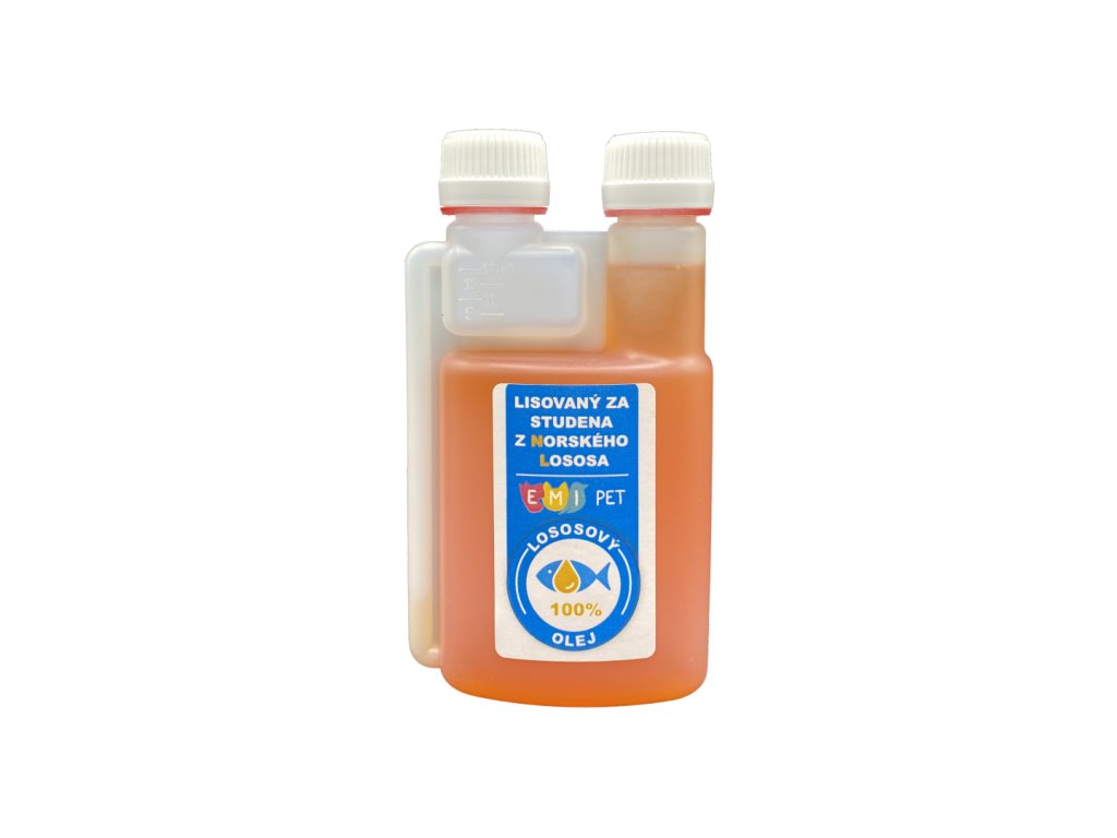 složení: za studena lisovaný lososový olej z norských lososů (EPA: 2-3 %, DHA: 3,5-5 %, omega-3: 14 %, omega-6: 14 %)